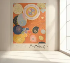 Questa vivace stampa d'arte presenta "The Ten Largest (No.8)" di Hilma af Klint, un'accattivante opera astratta del 1907. La composizione è collocata su un caldo sfondo arancione, con un'intricata serie di spirali vorticose, cerchi concentrici e forme organiche in una ricca tavolozza di gialli, blu, rosa e viola. Firmata "H. af Klint", quest'opera mostra la visione spirituale e astratta pionieristica di Klint, che esplora i temi della crescita e dell'interconnessione. Questo poster digitale di alta qualità (7000x5000 pixel, 300 dpi) cattura magnificamente la bellezza eterea e l'arte innovativa di Klint.