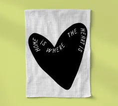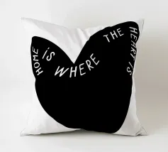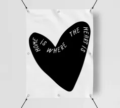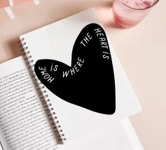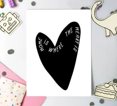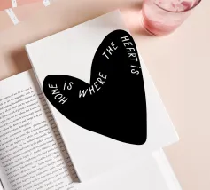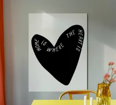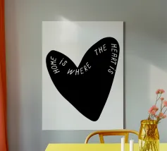 La forma di un cuore nero è caratterizzata dalla frase "Home is where the heart is" (La casa è dove c'è il cuore) in caratteri bianchi. Le parole si curvano lungo il contorno del cuore, creando un design elegante e accurato.