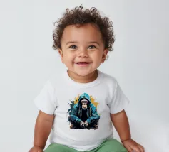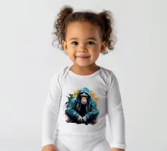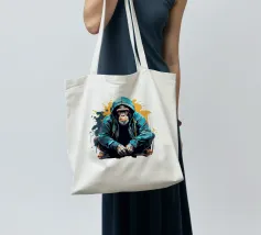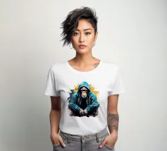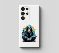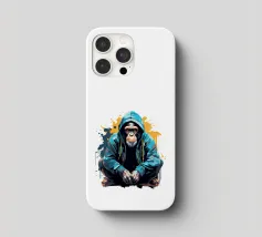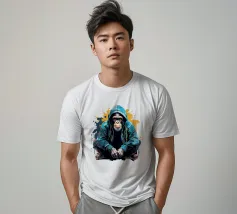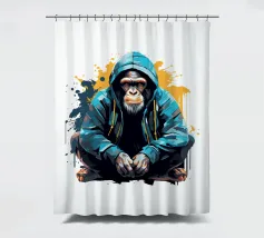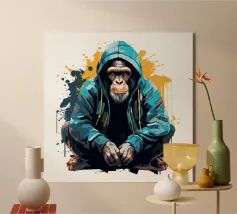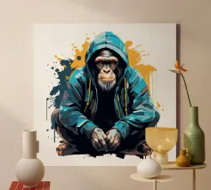 Illustrazione di uno scimpanzé seduto a gambe incrociate con indosso una felpa blu con cappuccio, circondato da vivaci schizzi di vernice arancione e blu, che combina elementi di street art urbana e artistica.