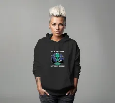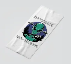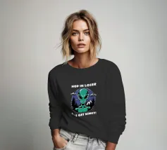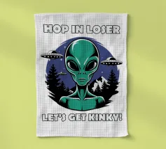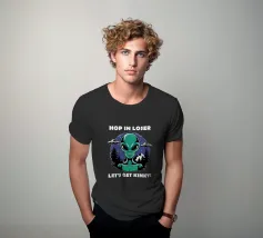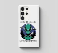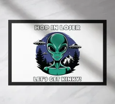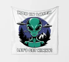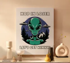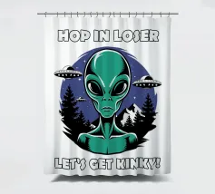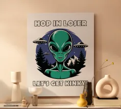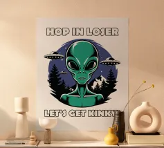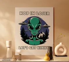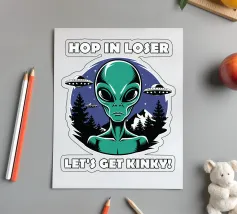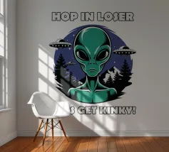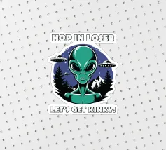 Un alieno verde con grandi occhi è sullo sfondo di pini e di un cielo notturno stellato, accompagnato da dischi volanti. Il testo recita: "Salta su perdente, diventiamo perversi!".