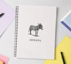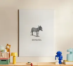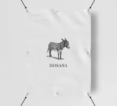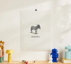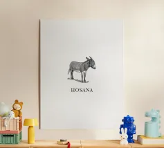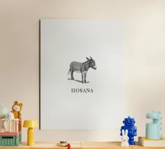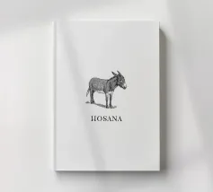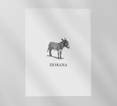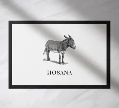 Un'illustrazione dettagliata di un asino è centrata su uno sfondo semplice, con la scritta "HOSANA" in basso. La semplicità del disegno mette in risalto l'intricatezza dei dettagli dell'asino.