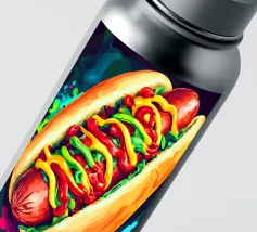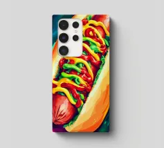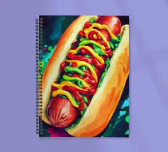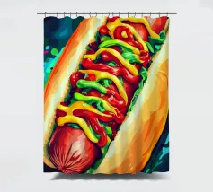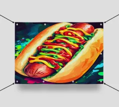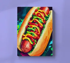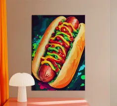 Questa immagine accattivante mostra un hot dog in stile pop art dinamico, ricoperto da fasci vibranti di ketchup, senape e colori verdi freschi. I colori vivaci e lo sfondo ad alto contrasto fanno sembrare il motivo quasi vivo e irradiano divertimento ed energia. Perfetto per gli appassionati di street food, per gli amanti della pop art e per gli spazi che traggono vantaggio da accenti audaci e colorati.