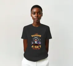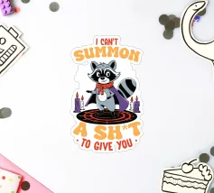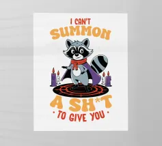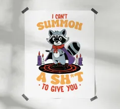 Un procione dei cartoni animati vestito con un mantello si trova su un cerchio magico, circondato da candele accese. Il testo sopra e sotto il procione recita umoristicamente: "Non posso evocare un cazzo da darti.