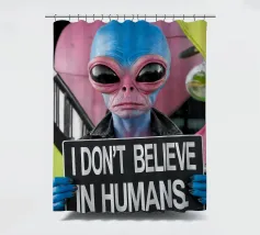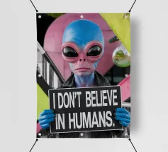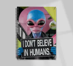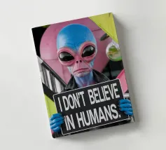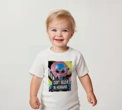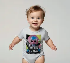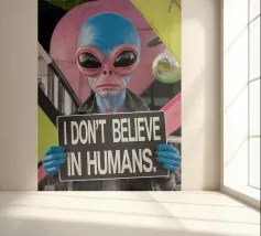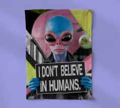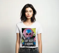 Un design giocoso e stravagante con un alieno che tiene in mano un cartello con la scritta "Non credo negli umani". Questo concetto umoristico ribalta il copione dello scetticismo alieno, offrendo una visione divertente e spensierata degli incontri extraterrestri. Perfetto per gli appassionati di fantascienza, i teorici della cospirazione o chiunque abbia un senso dell'umorismo cosmico.