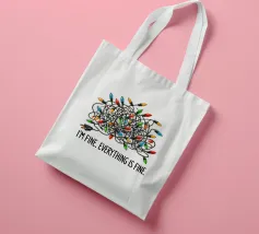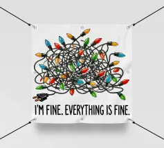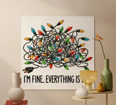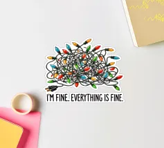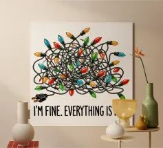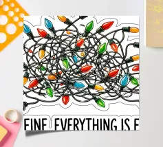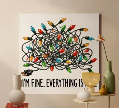Un groviglio di luci natalizie colorate è accompagnato dal testo "I'm fine. Tutto va bene" su uno sfondo semplice. La frase contrasta in modo umoristico con il caos delle luci.
