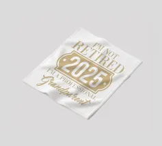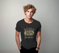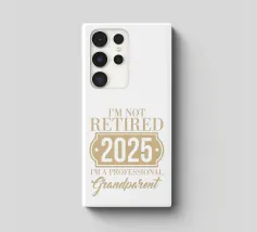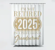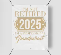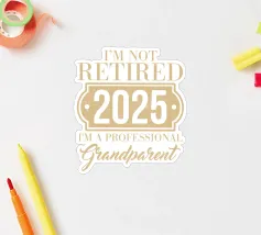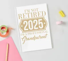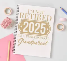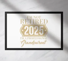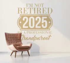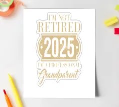 Un messaggio motivazionale recita con umorismo "Non sono in pensione, 2025, sono un nonno professionista" in un carattere elegante. Il testo sottolinea una visione giocosa della pensione e della nonnità.