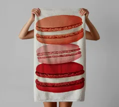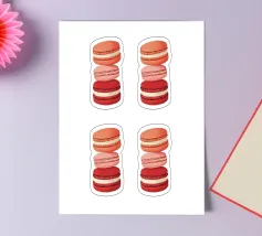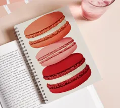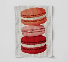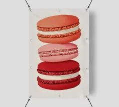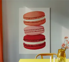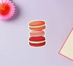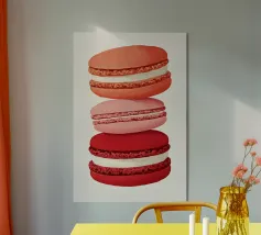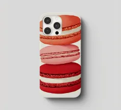 L'immagine mostra tre macarons impilati dai colori caldi - arancio, rosa e rosso - con un ripieno cremoso. Lo stile è minimalista ed esteticamente gradevole, con un'attenzione particolare ai contrasti di colore e alla consistenza. La composizione appare moderna e appetitosa, quasi da rivista gastronomica di alto livello o da campagna pubblicitaria di pasticceria francese.