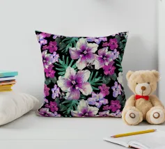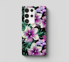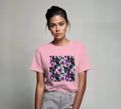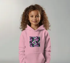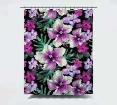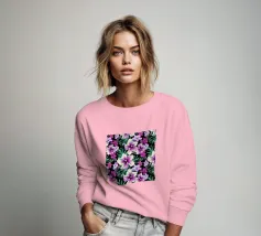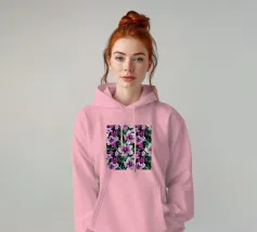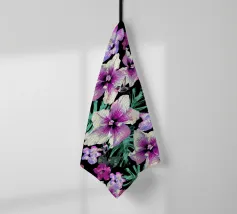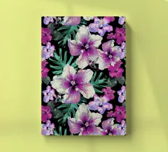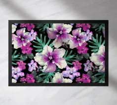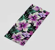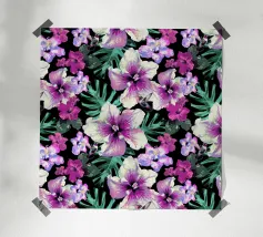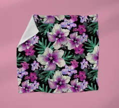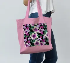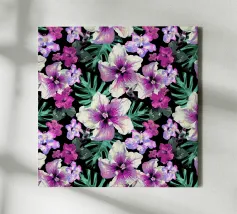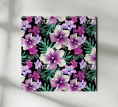 Motivo di ibisco tropicale con colibrì e foglie di palma in rosa, viola e verde. Collage di foto digitali dipinte da fiori visti durante una passeggiata mattutina.
