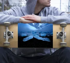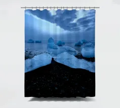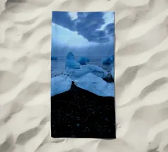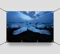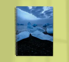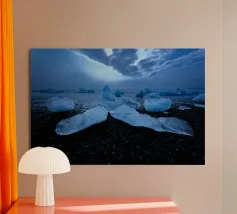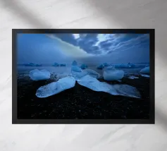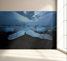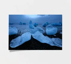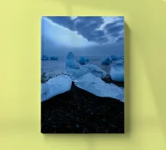 Sotto la superficie, la maggior parte della loro massa rimane nascosta, galleggiando come giganti congelati. Il mare freddo si estende all'infinito intorno a loro, scuro e profondo, con le onde che lambiscono dolcemente le pareti ghiacciate. Un senso di immobilità e stupore riempie l'aria, mentre le sculture ghiacciate della natura navigano nelle acque gelide".