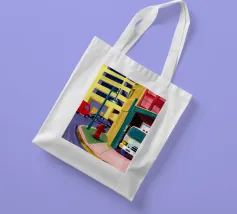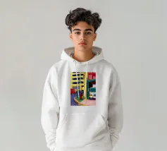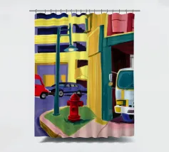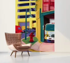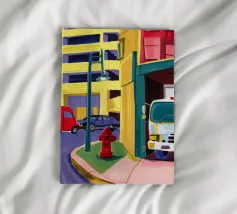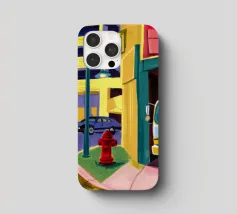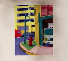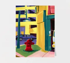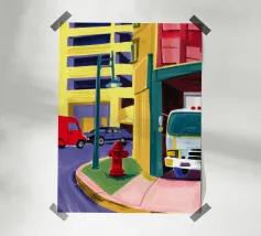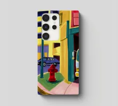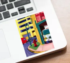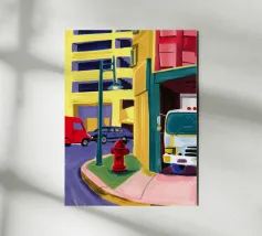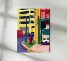 Un idrante rosso vivo e una cassetta postale si trovano all'angolo della città, con i loro colori brillanti che risaltano sugli edifici stilizzati e sulla strada, una celebrazione dei dettagli urbani.