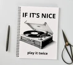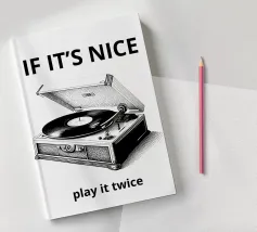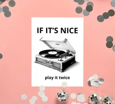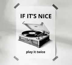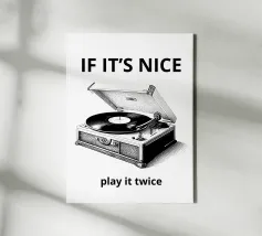 Un giradischi vintage con un disco in vinile è accompagnato dal testo "IF IT'S NICE, play it twice". Il design in bianco e nero sottolinea un tema nostalgico e musicale.