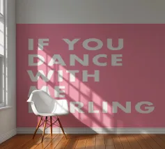 Una scena romantica e stravagante di due figure che danzano sotto un baldacchino di luci fatate scintillanti. La frase "If You Dance with Me, Darling" è scritta con una scrittura elegante e fluida, incastonata tra delicati accenti floreali. Le morbide tonalità pastello e il cielo notturno da sogno creano un'atmosfera di intimità e magia.