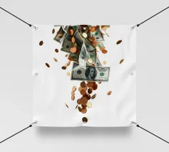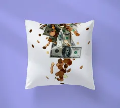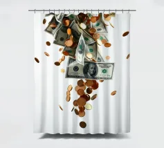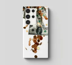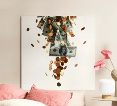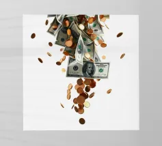 Ricchezza in movimento: La caduta della moneta Un'immagine di denaro che cade su uno sfondo bianco. Banconote e monete fluttuano verso il basso, mostrando pieghe intricate e delicati riflessi in uno stile di arte digitale surreale.