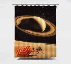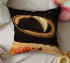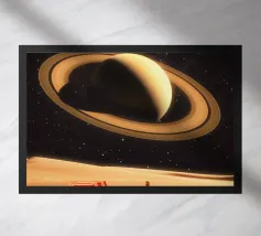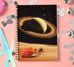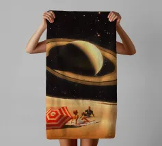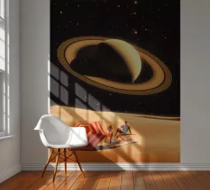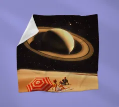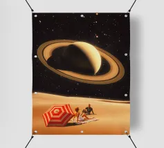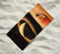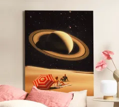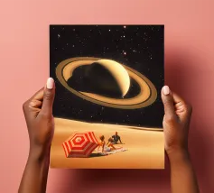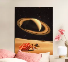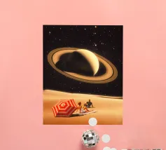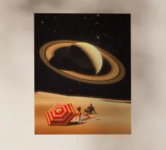 Un collage retrofuturistico di Taudalpoi che raffigura una coppia che ha un appuntamento romantico tra le dune del deserto con Saturno e l'inizio alle loro spalle.
