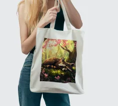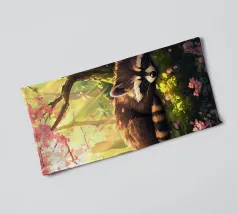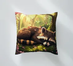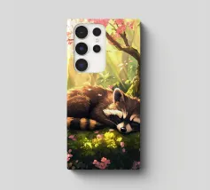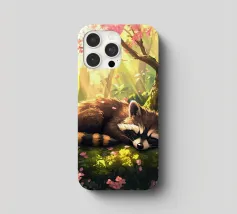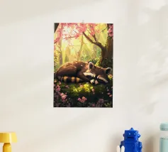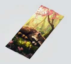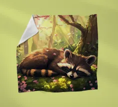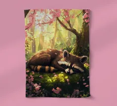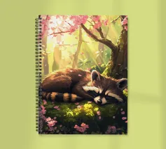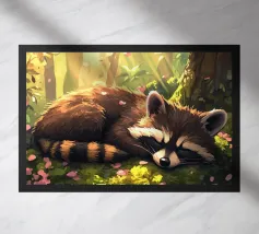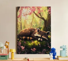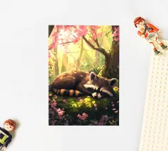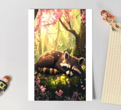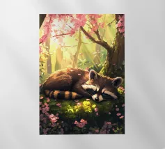 Un procione addormentato giace sul pavimento di una foresta ricoperta di muschio, circondato da ciliegi in fiore. I raggi di sole penetrano nella chioma di foglie e immergono la scena in una luce soffusa. La composizione trasmette pace, sicurezza e la bellezza della natura.