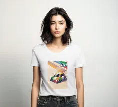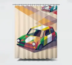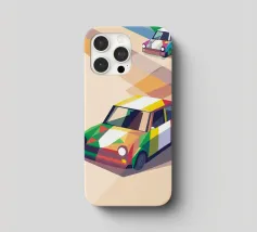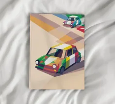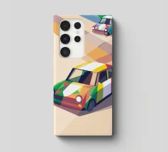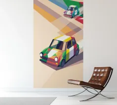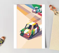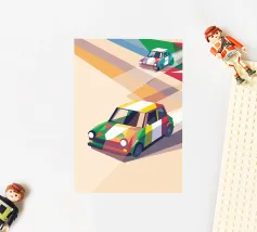 Illustrazione di due auto da corsa con una combinazione di colori unica sulla strada con uno stile geometrico moderno.