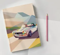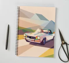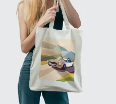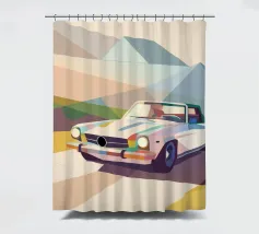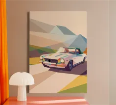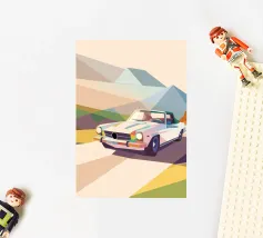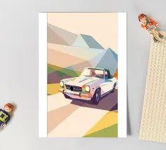 Illustrazione di un'auto classica decappottabile su una strada di montagna con uno stile geometrico moderno.