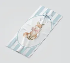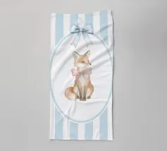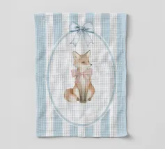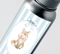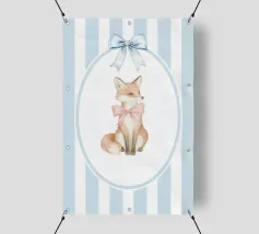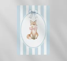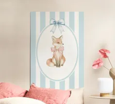 Incantevole illustrazione di una volpe con un fiocco rosa, su uno sfondo a righe bianche e blu, perfetta per l'arredamento di una cameretta o per inviti a una festa per bambini.
