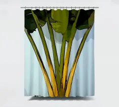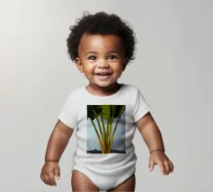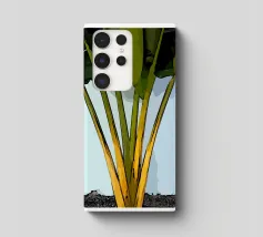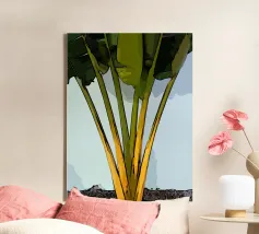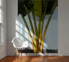 Una pianta in crescita con grandi foglie si staglia su una parete blu.