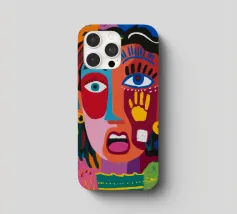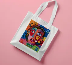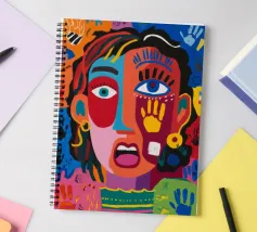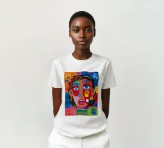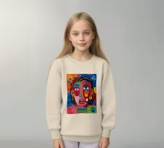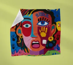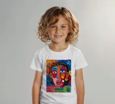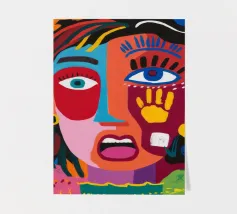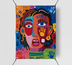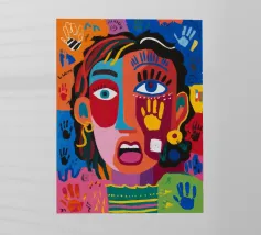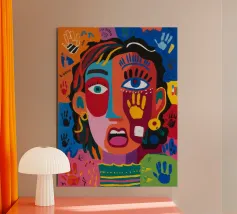 Un volto sorprendente circondato da impronte di mani colorate e tratti astratti dinamici. La composizione visiva, giocosa ma intensa, rende il dipinto accattivante ed energico.