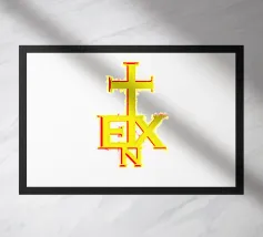 Questa sorprendente opera d'arte da parete presenta un'audace composizione a forma di croce intrecciata con intricate scritte in stile gotico, illuminate in un vibrante giallo e rosso neon.