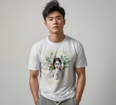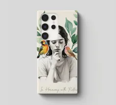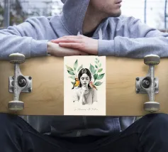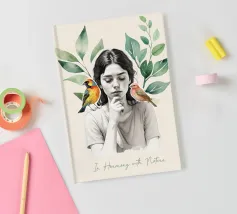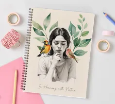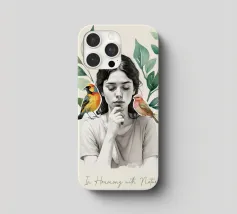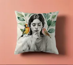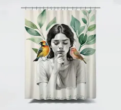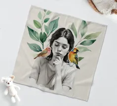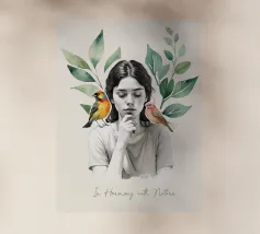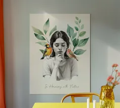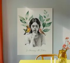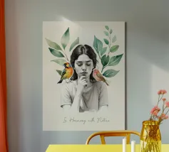 Una serena stampa d'arte botanica con una giovane donna riflessiva circondata da foglie verdi e due uccelli colorati. Questa illustrazione ispirata alla natura fonde un delicato realismo con texture ad acquerello, creando un'atmosfera pacifica e meditativa. Perfetta per aggiungere un tocco di calma, consapevolezza e connessione con la natura all'arredamento della casa, dell'ufficio o dello spazio yoga. Regalo ideale per gli amanti degli uccelli e per gli appassionati di arte botanica da parete.
