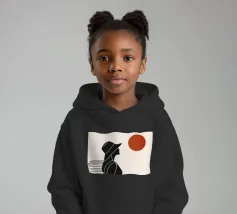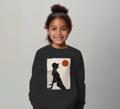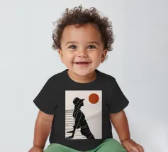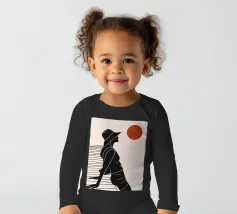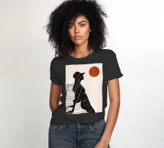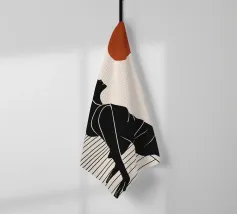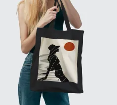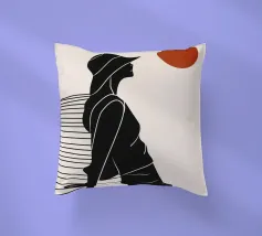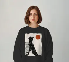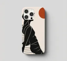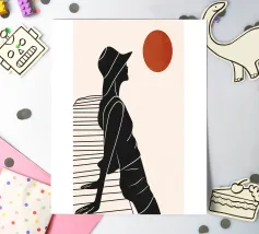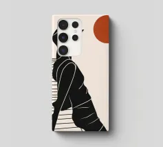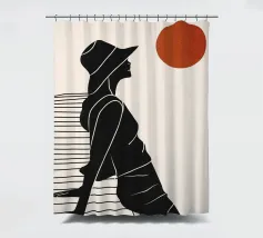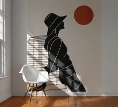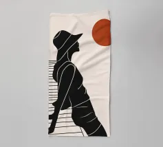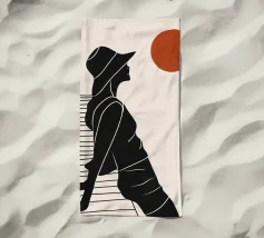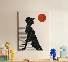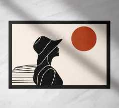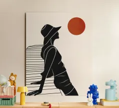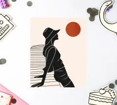 Una donna siede su un molo e si gode il calore del sole. La scena calma cattura un momento di tranquillità in riva al mare. Le linee minimali e i toni della terra conferiscono a quest'opera un'atmosfera morbida e senza tempo.