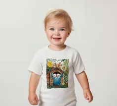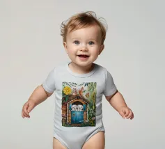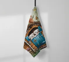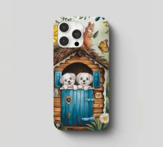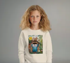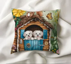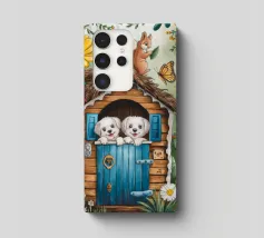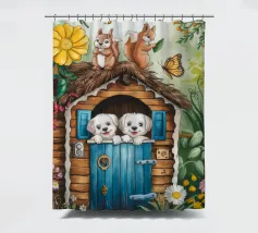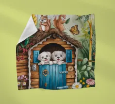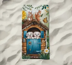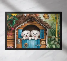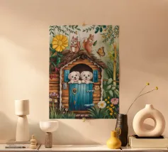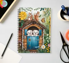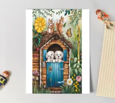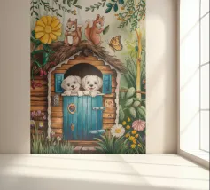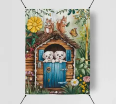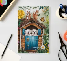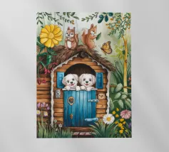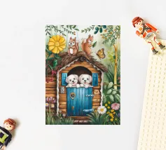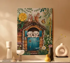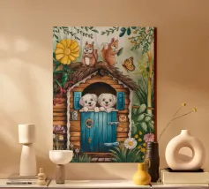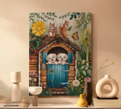 Questa opera d'arte mostra un'accogliente casa di legno con una porta blu, affiancata da due cani seduti davanti. Un gatto e uno scoiattolo sono appollaiati sul tetto, circondati da piante rigogliose, fiori e un imponente girasole, che emanano calore e fascino.