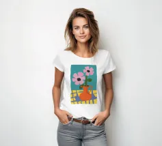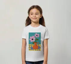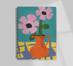 Una brocca arancione sostiene tre fiori rosa stilizzati su uno sfondo bicolore verde e verde, creando un pezzo floreale semplice, sereno e moderno.