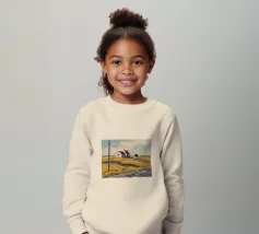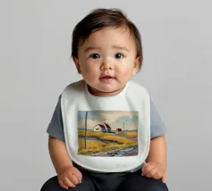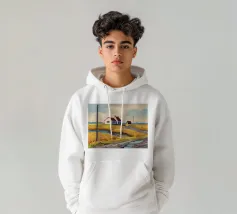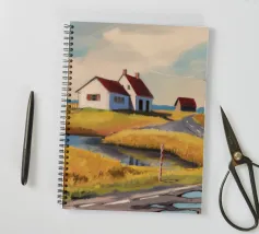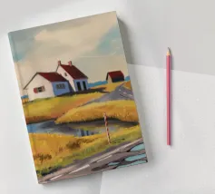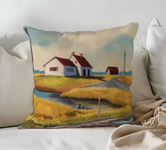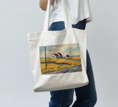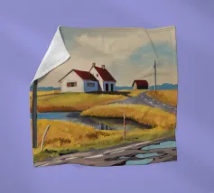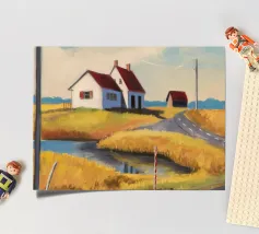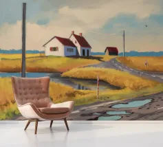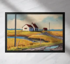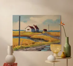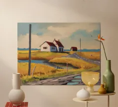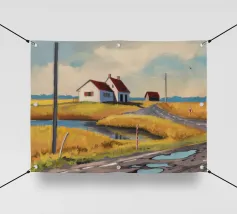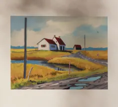Un dipinto di un paesaggio rurale con una strada polverosa, semplici case coloniche e pali della luce sotto un cielo vasto, che evoca un senso di spazio aperto e tranquillo.