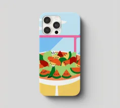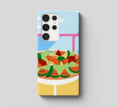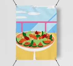 Illustrazione che mostra una macedonia di frutta fresca con vari frutti come banane, mele e fragole.