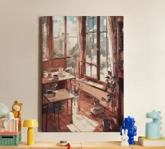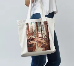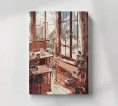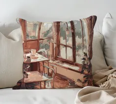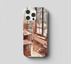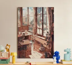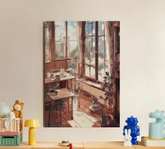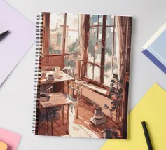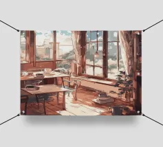 finestra luce solare tende paesaggio urbano grattacieli nuvole tazze da tè sedie pavimento in legno libri tavolo pianta da interno pianta in vaso scaffali stanza illuminata dal sole interno accogliente vista urbana tazze da caffè arredamento d'interni luce del mattino
