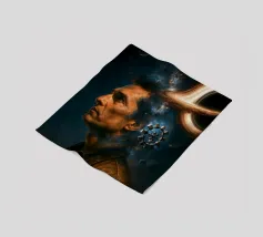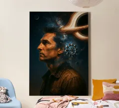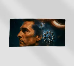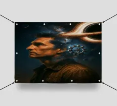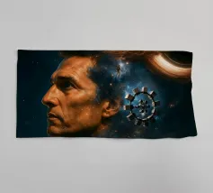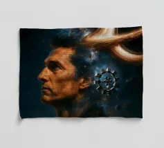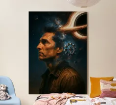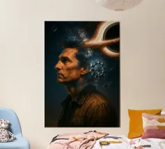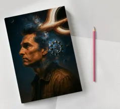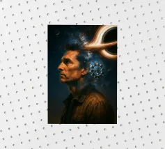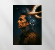Viaggiate nel cosmo con questo poster ispirato a Interstellar con l'astronauta Cooper, il maestoso buco nero Gargantua e una galassia di stelle. Un omaggio al capolavoro fantascientifico di Christopher Nolan, che fonde spazio, cinema e astronomia in un epico universo cinematografico.