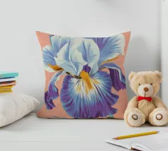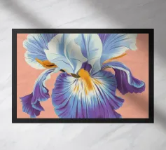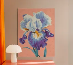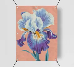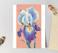 Una rappresentazione dettagliata e vibrante di un singolo fiore di iris in piena fioritura, che mostra i suoi intricati petali nei toni del blu, del viola, del bianco e del giallo. L'attenzione si concentra sulla maestosa bellezza del fiore.
