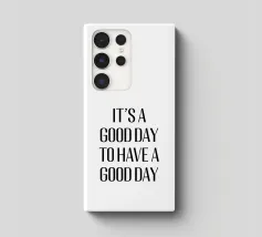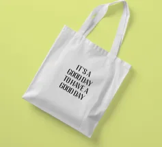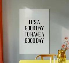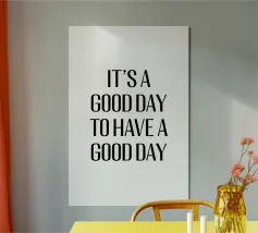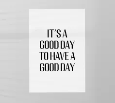 Questo design minimalista presenta lo slogan motivazionale "IT'S A GOOD DAY TO HAVE A GOOD DAY" (È UN BUON GIORNO PER AVERE UN BUON GIORNO) in grassetto, con caratteri neri su sfondo bianco. La tipografia chiara e semplice e la scelta di colori contrastanti rendono questo design un perfetto richiamo visivo, moderno e stimolante. Il messaggio è un promemoria quotidiano per avere un atteggiamento positivo e godersi ogni giorno.