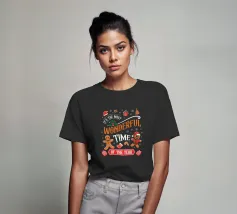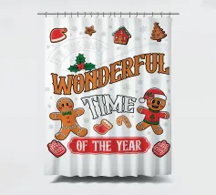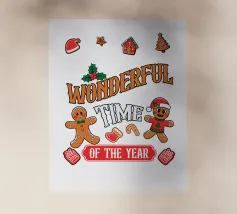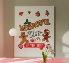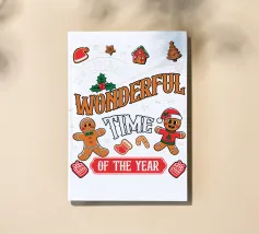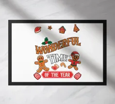 Immagini festive circondano la scritta "It's the Most Wonderful Time of the Year", con personaggi di pan di zenzero, fiocchi di neve e decorazioni a tema natalizio.