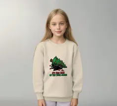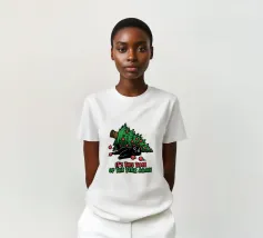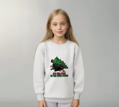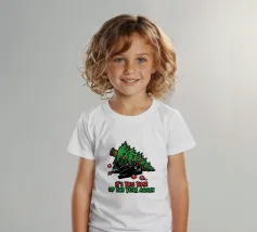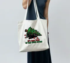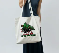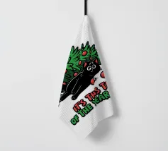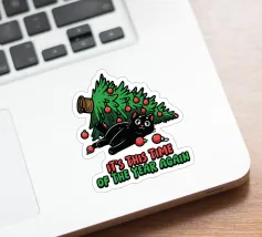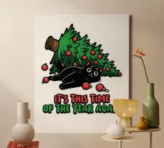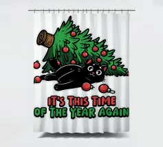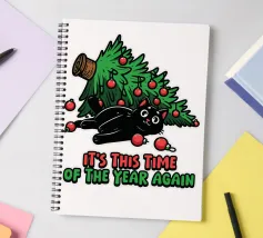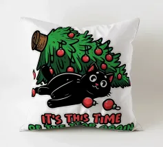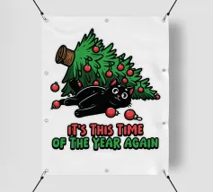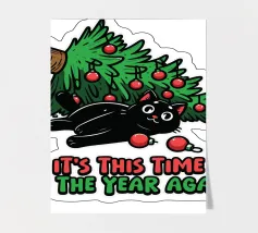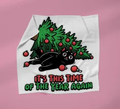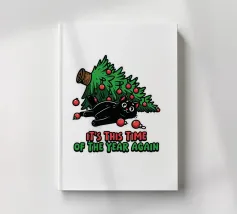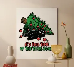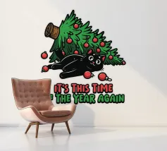 Un gatto nero si aggira giocoso sotto un albero di Natale rovesciato, circondato da ornamenti rossi sparsi. La frase "It's This Time of the Year Again" (È di nuovo questo periodo dell'anno) è riportata in grassetto a lettere rosse e verdi sotto la scena.