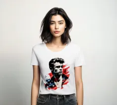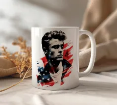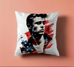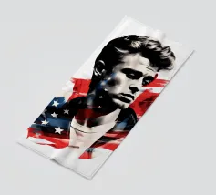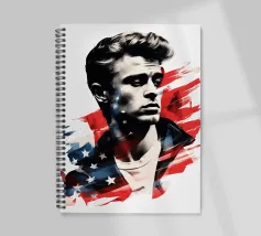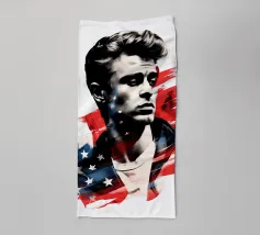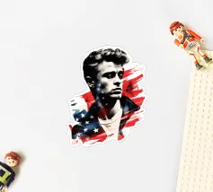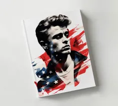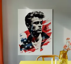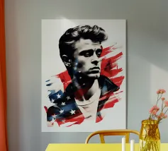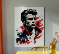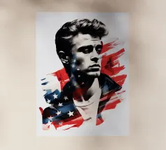 Un ritratto come un manifesto: i tratti ricordano James Dean - simbolo di ribellione giovanile, forza vulnerabile e sogno americano al tramonto. La sovrapposizione di stelle e strisce trasforma l'immagine in una riflessione su identità, libertà e proiezione. Stilisticamente a metà tra pop art, manifesto cinematografico e pathos patriottico, l'opera sembra un'eco dell'epoca in cui la freddezza e la malinconia divennero l'atteggiamento di un'intera generazione. Ideale per ambienti che intendono mostrare le icone come specchio della società.