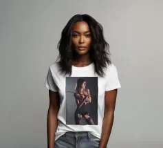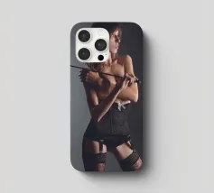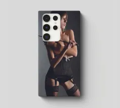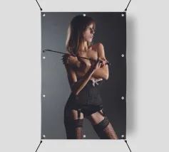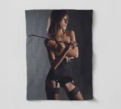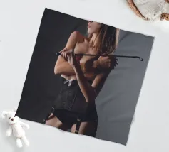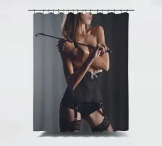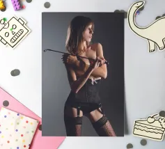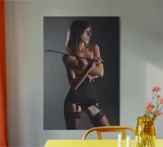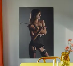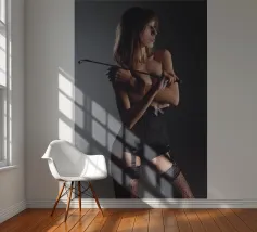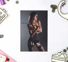 Una giovane donna in lingerie nera con in mano un frustino da equitazione