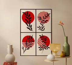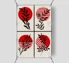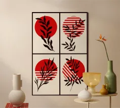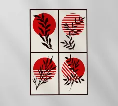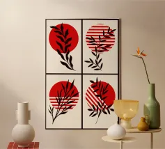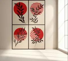 Questa serie di quattro opere d'arte astratte fonde audaci soli rossi con eleganti rami botanici neri, ogni composizione combina in modo unico forme geometriche e forme organiche. Ispirata all'estetica giapponese, la serie fonde il minimalismo giapponese e l'armonia scandinava, creando un'esperienza visiva tranquilla ed equilibrata. La tavolozza calda e i contrasti sorprendenti evocano la natura, la calma e il design senza tempo, perfetti per aggiungere un tocco di raffinatezza artistica e serenità a qualsiasi spazio.