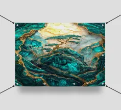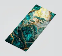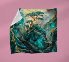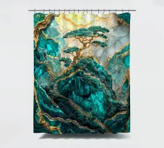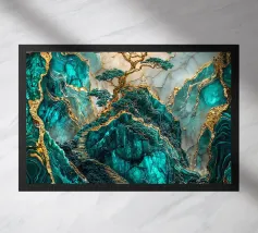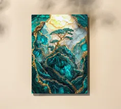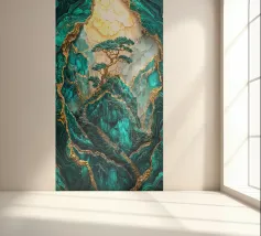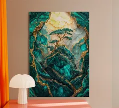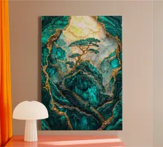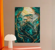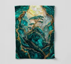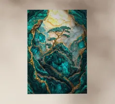 Una scalinata si snoda tra scogliere di smeraldo venate d'oro e conduce a un albero sacro incoronato di luce. Alle sue radici, un santuario nascosto risplende: una visione kintsugi in cui la pietra fratturata diventa un pellegrinaggio gioioso di spirito e armonia.
