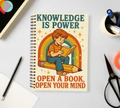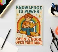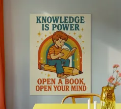 Un bambino è seduto e legge un libro sopra una grande matita, circondato da un arcobaleno colorato e da stelle. Le frasi "La conoscenza è potere" e "Apri un libro, apri la tua mente" sottolineano l'importanza della lettura e dell'istruzione.