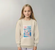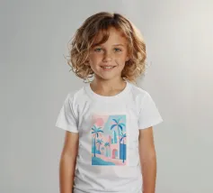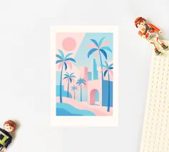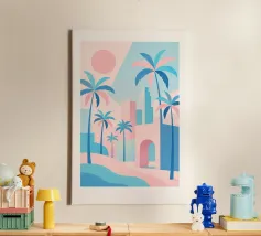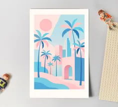 Una Los Angeles grafica, geometrica e rilassante. Linee pulite, edifici moderni e un oceano stilizzato si incontrano in una tavolozza di colori pastello. Un poster perfetto per un arredamento minimalista ispirato ai grandi spazi aperti della California.