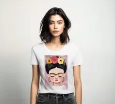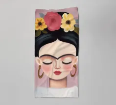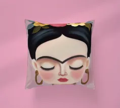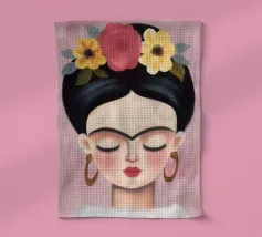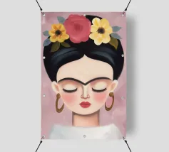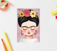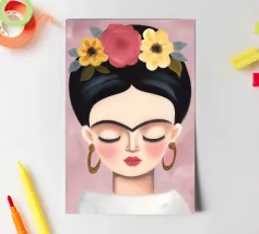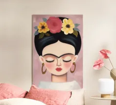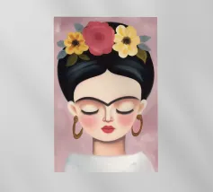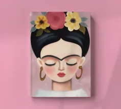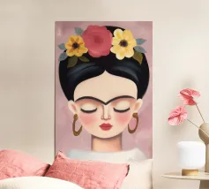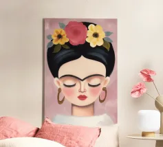 L'arte murale digitale in tenui toni pastello è una simpatica illustrazione della famosa pittrice messicana Frida Kahlo, raffigurata con gli occhi chiusi e una delicata corona di fiori su uno sfondo rosa. Questa opera d'arte ispiratrice cattura la presenza audace e l'espressione potente dell'icona ed è un'aggiunta perfetta a qualsiasi interno che incarni bellezza e forza.
