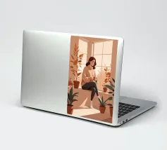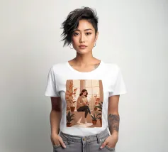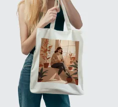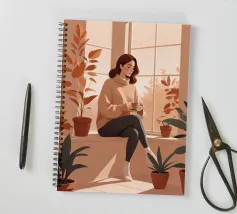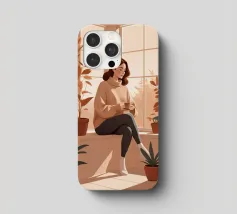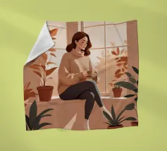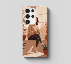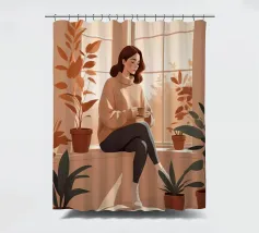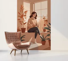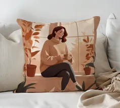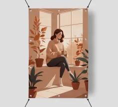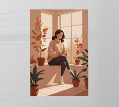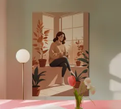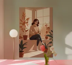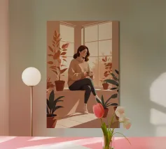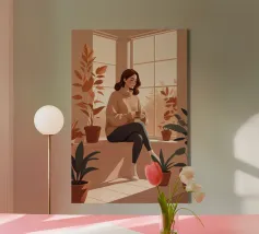 Una scena minimalista di una donna che si gode il suo caffè accanto a finestre bagnate dal sole e piante verdi. Le tonalità dorate della luce del tardo pomeriggio riempiono la stanza di comfort e nostalgia, rendendo quest'opera d'arte un dolce promemoria per fermarsi e respirare. Ideale per spazi moderni che celebrano il calore e la consapevolezza.