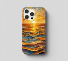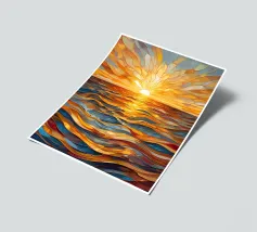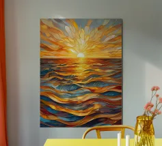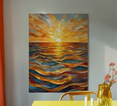 Un tramonto vibrante e accattivante sull'oceano, reso in uno splendido stile di vetro colorato.