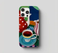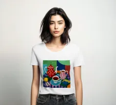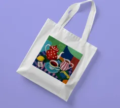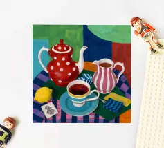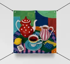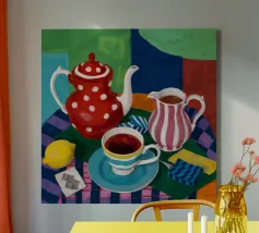 Una natura morta stravagante e colorata incentrata su una teiera a pois rossi e una brocca a righe. Una tazza di tè blu e limoni completano questa giocosa scena a fantasia su uno sfondo colorato viola e verde.
