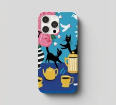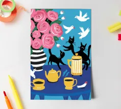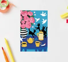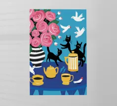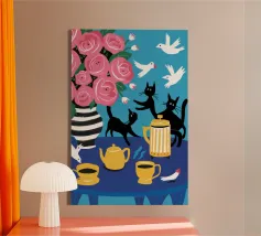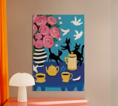 Una stravagante natura morta di un servizio da tè con colombe bianche in volo e rose rosa che emergono da un vaso a righe, creando una scena magica e surreale dell'ora del tè su uno sfondo scuro.