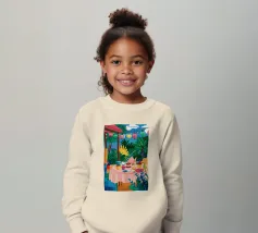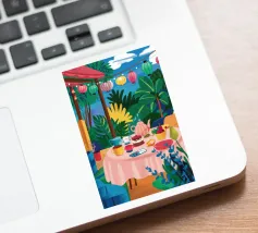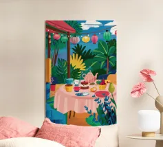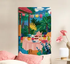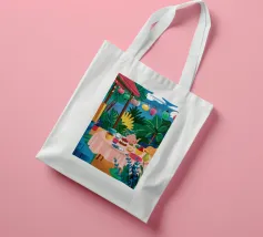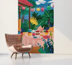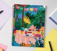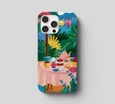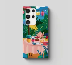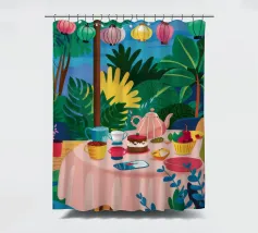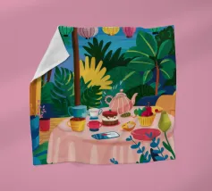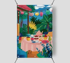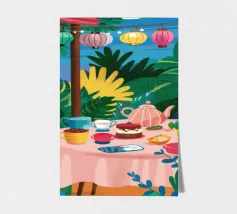 Illustrazione di una tavola imbandita per il tè in un giardino verde e rigoglioso, circondato da piante e fiori. La scena è una rappresentazione vivace, allegra e idilliaca di un perfetto tea party all'aperto.