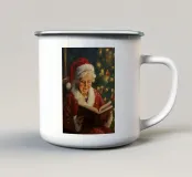 Questa bella immagine mostra la signora Babbo Natale con un cappotto rosso con orlo di pelliccia bianca e cappello, che legge comodamente un libro. Sullo sfondo brilla un albero di Natale addobbato a festa con luci scintillanti e decorazioni. Un motivo d'atmosfera che irradia calore, intimità e contemplazione natalizia. Ideale per poster, opere d'arte da parete, biglietti d'auguri o oggetti decorativi per portare l'atmosfera festiva in casa.